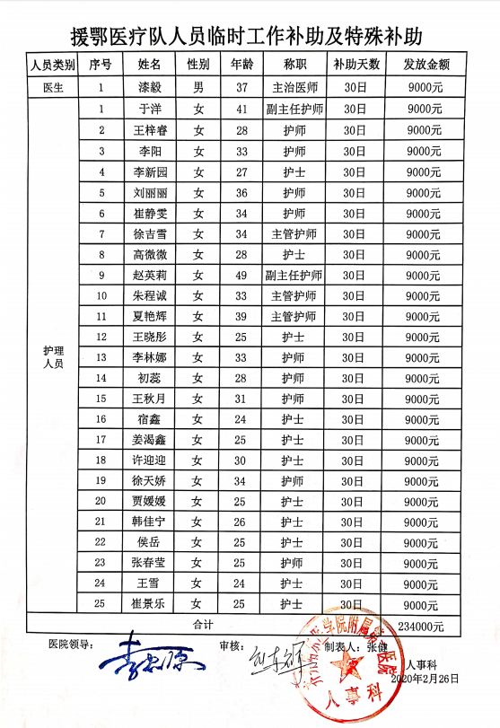 医院将拨付赴武汉抗疫医疗队26名队员每人每天300元的特殊补助,现发放30日补助(每人9000元)存至每位队员的工资卡中,特此公示。