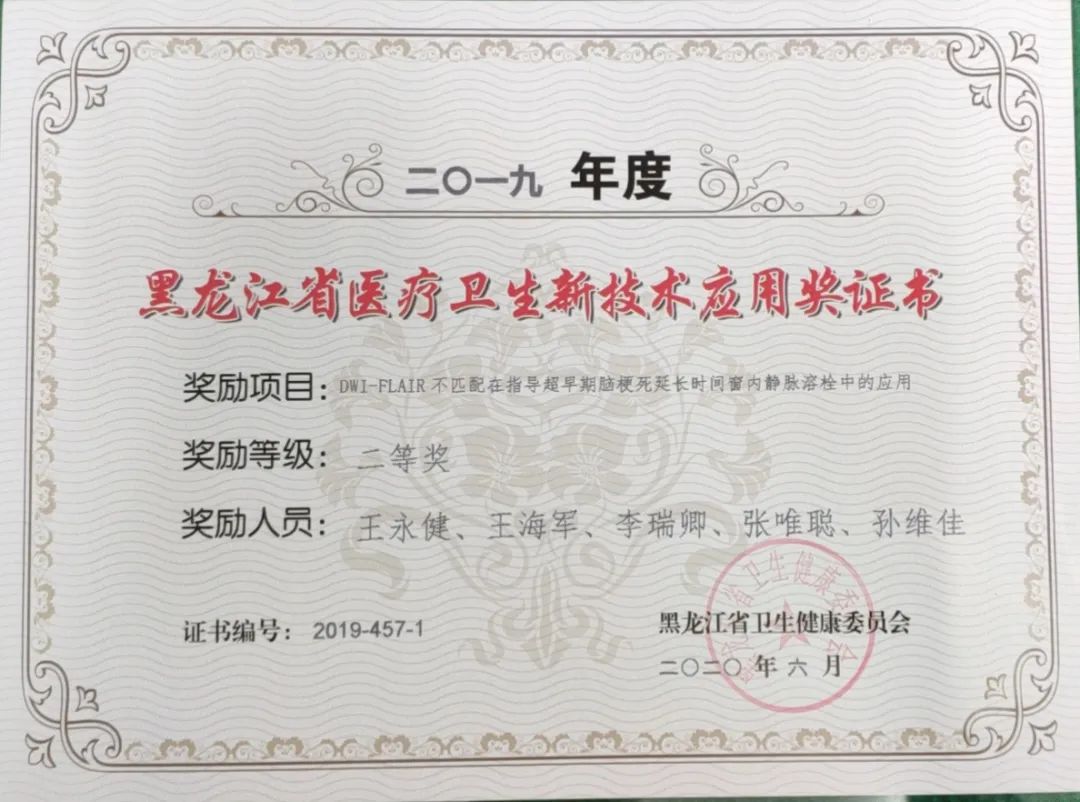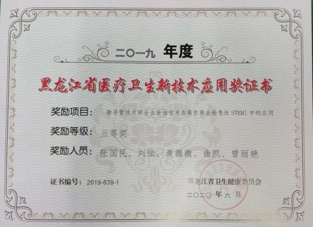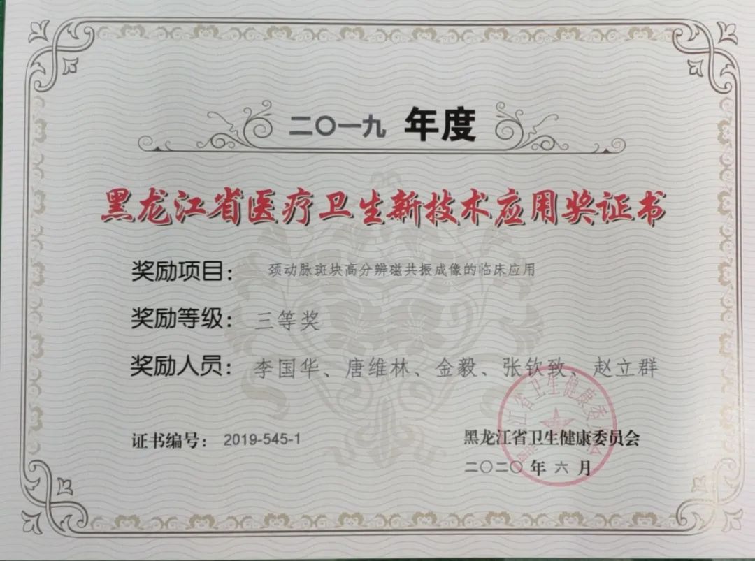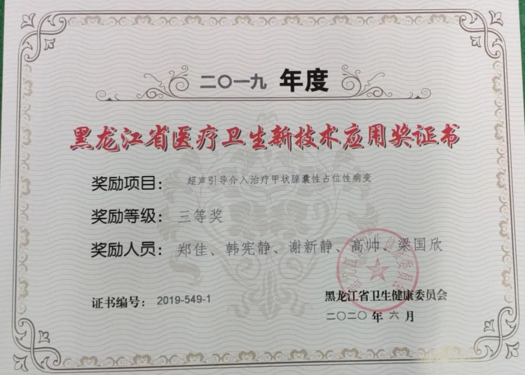 《腹腔镜下保胆取石、保胆取息肉》《微导管技术联合血栓抽吸术在高负荷血栓急性STEMI中的应用》《数字减影机监视下行尿道扩张术治疗尿道狭窄》《DWI-FLAIR不匹配在指导超早期脑梗死延长时间窗内静脉溶栓中的应用》四个临床项目经专家组评审,认为具有较强实践性,解决患者的就医难题,具有可推广性。《颈动脉斑块高分辨磁共振成像的临床应用》《超声引导介入治疗甲状腺囊性占位性病变》项目被评委省级新技术三等奖。