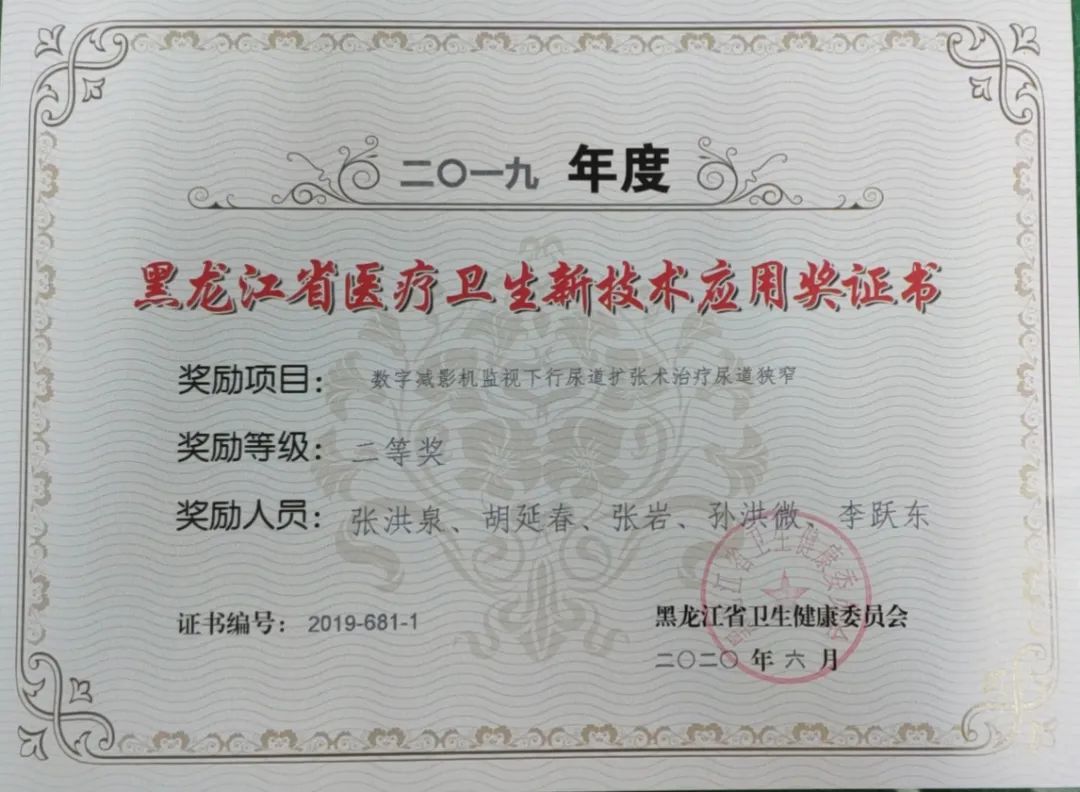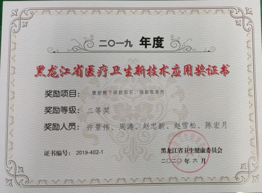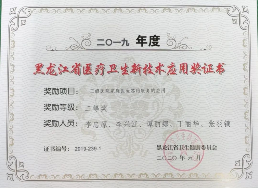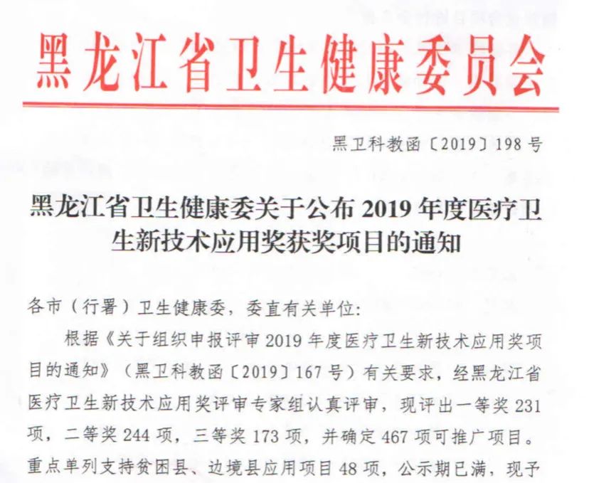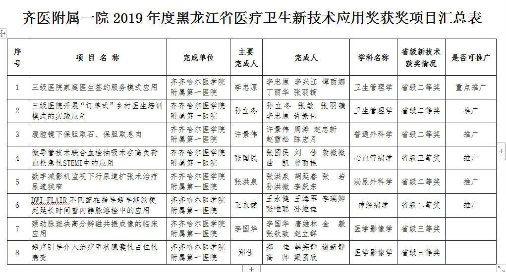 近日,黑龙江省卫健委公布了2019年度省医疗新技术应用奖获奖项目。齐齐哈尔医学院附属第一医院共获奖8项,其中获省级二等奖5项,三等奖3项。我院院长、党委副书记李忠原申报的项目《三级医院家庭医生签约服务模式应用》被评为省级重点推广项目,孙立冬、许景伟、张国民、张洪泉和王永健申报的新技术项目被评为省级推广项目。