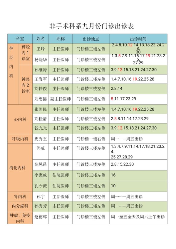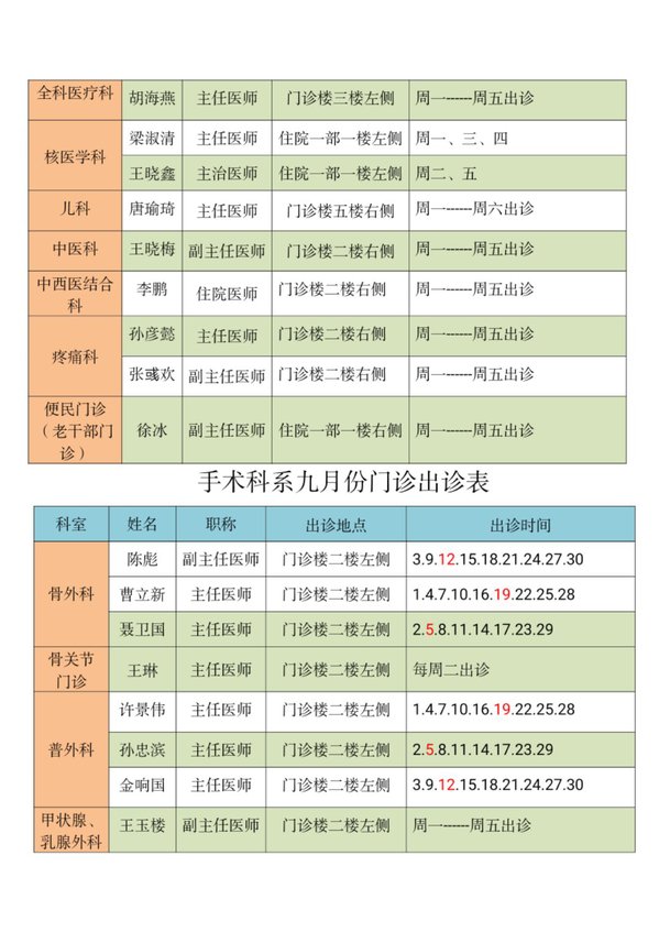 齐齐哈尔医学院附属第一医院9月份出诊表
