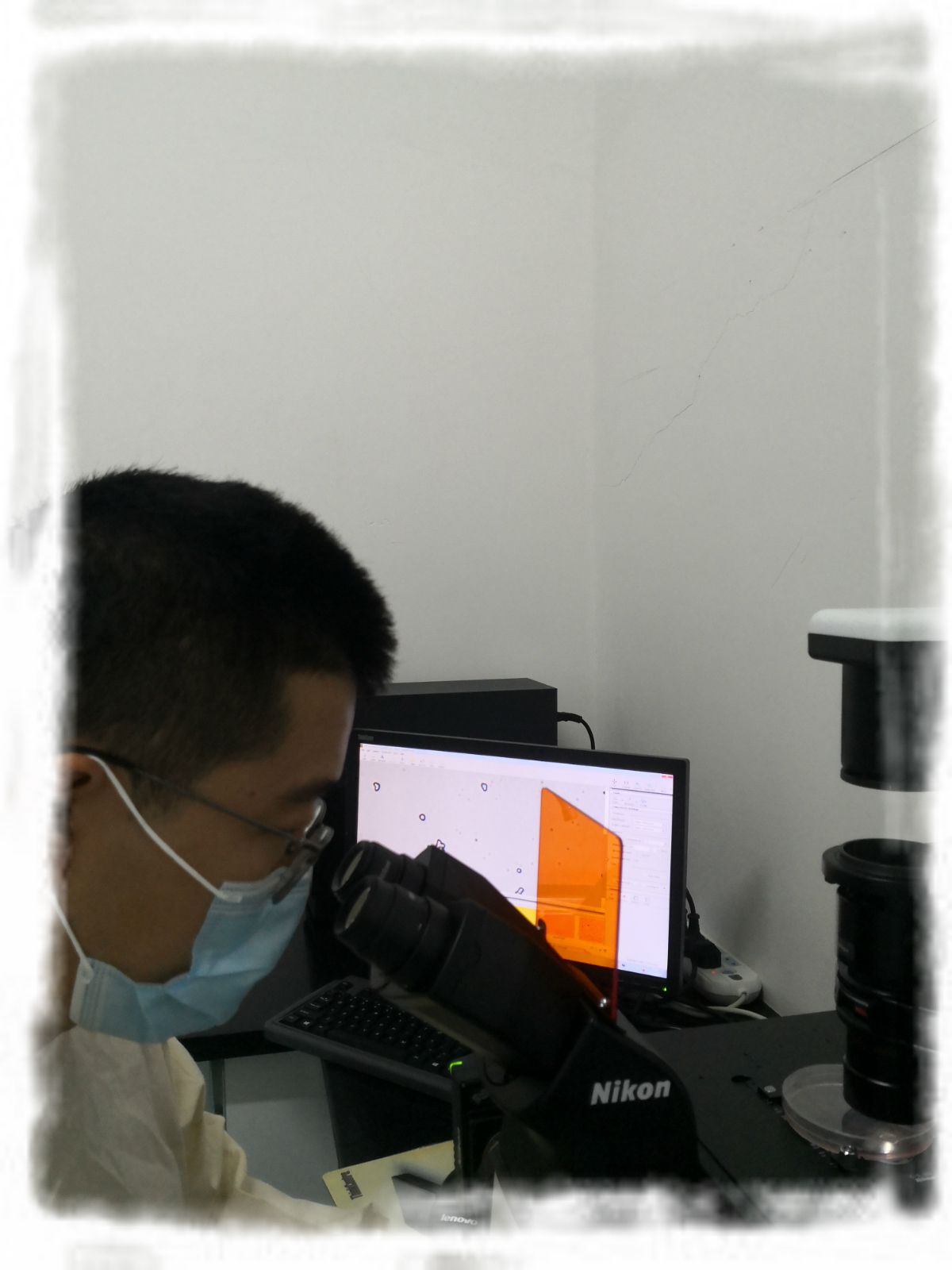 科研人员利用倒置荧光显微镜及成像系统对培养皿中细胞进行观察