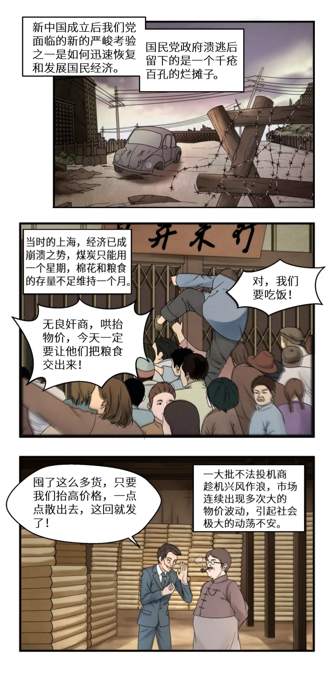 当时的上海,经济已成崩溃之势,煤炭只够用一个星期,棉花和粮食的存量不足维持一个月,一大批不法投机商趁机兴风作浪,市场连续出现多次大的物价波动,引起社会极大的动荡不安。