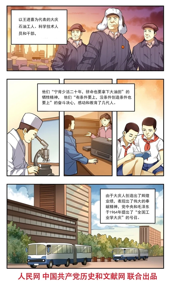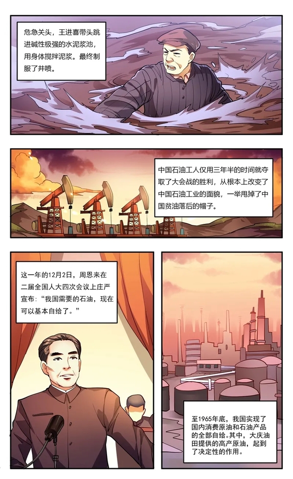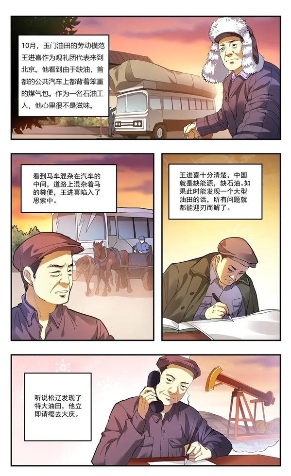 10月,玉门油田的劳动模范王进喜作为观礼团代表来到北京。他看到,由于缺油,首都的公共汽车上都背着笨重的煤气包。作为一名石油工人,他心里很不是滋味。听说松辽发现了特大油田,他立即请缨去大庆。