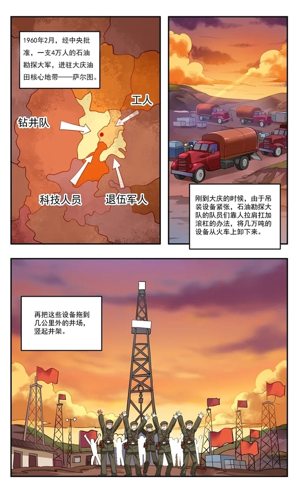 1960年2月,经中央批准,石油工业部从全国抽调几十个优秀钻井队、几千名科技人员、工人和7万余吨器材、设备,加上当年退伍的3万名军人,组成一支4万人的石油勘探大军,进驻大庆油田核心地带——萨尔图。