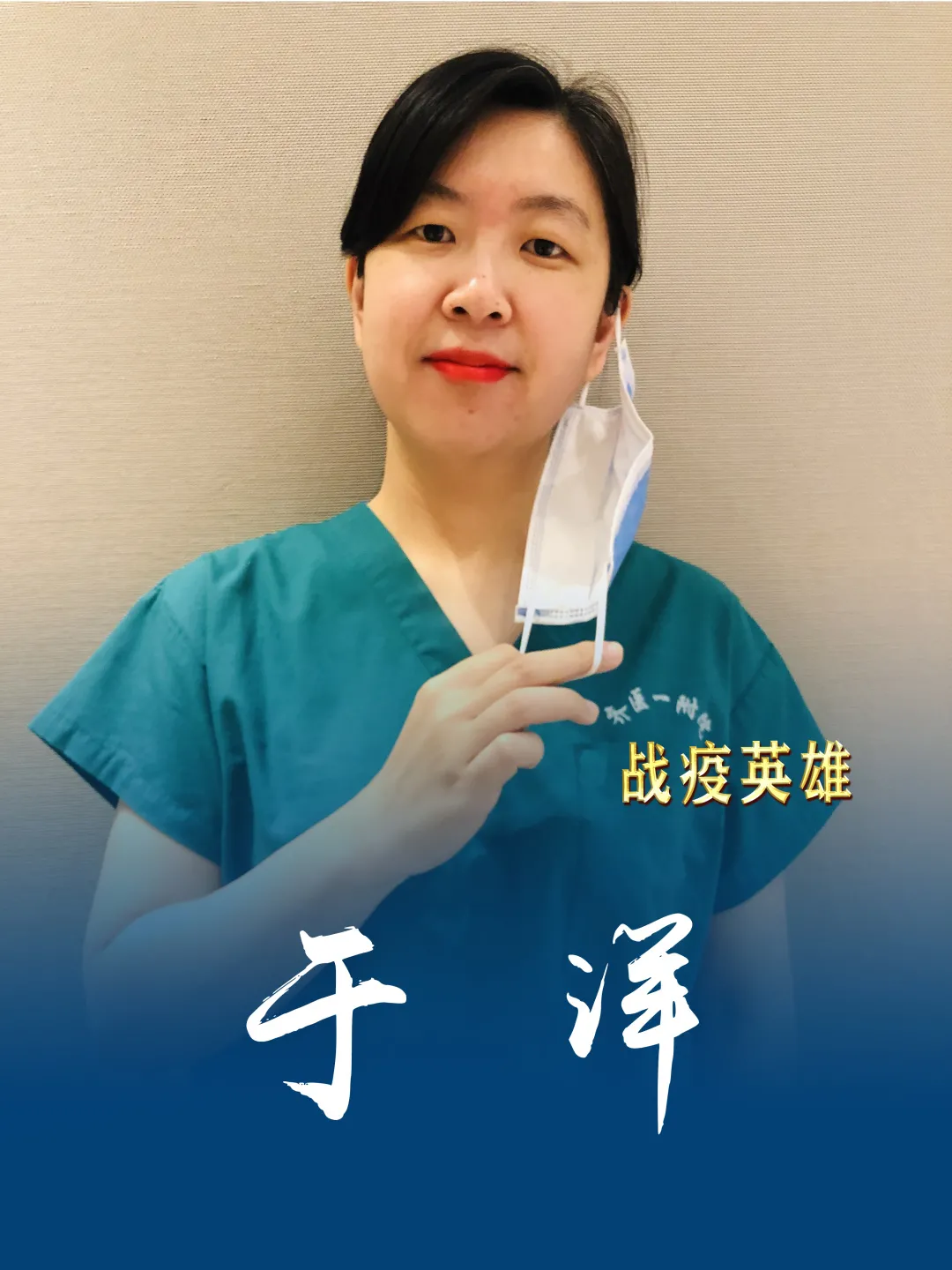 于洋,齐齐哈尔医学院附属第一医院神经内科四病区护士长,黑龙江省第二批支援武汉抗疫医疗队副队长、临时党总支组织委员、齐医附属一院支援武汉抗疫医疗队分队长、临时党支部书记。获抗击新冠疫情全国三八红旗手、黑龙江省杰出护理工作者、龙江好人等荣誉称号。