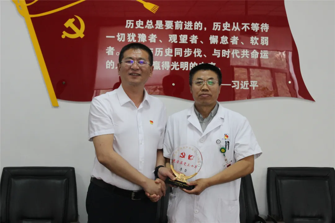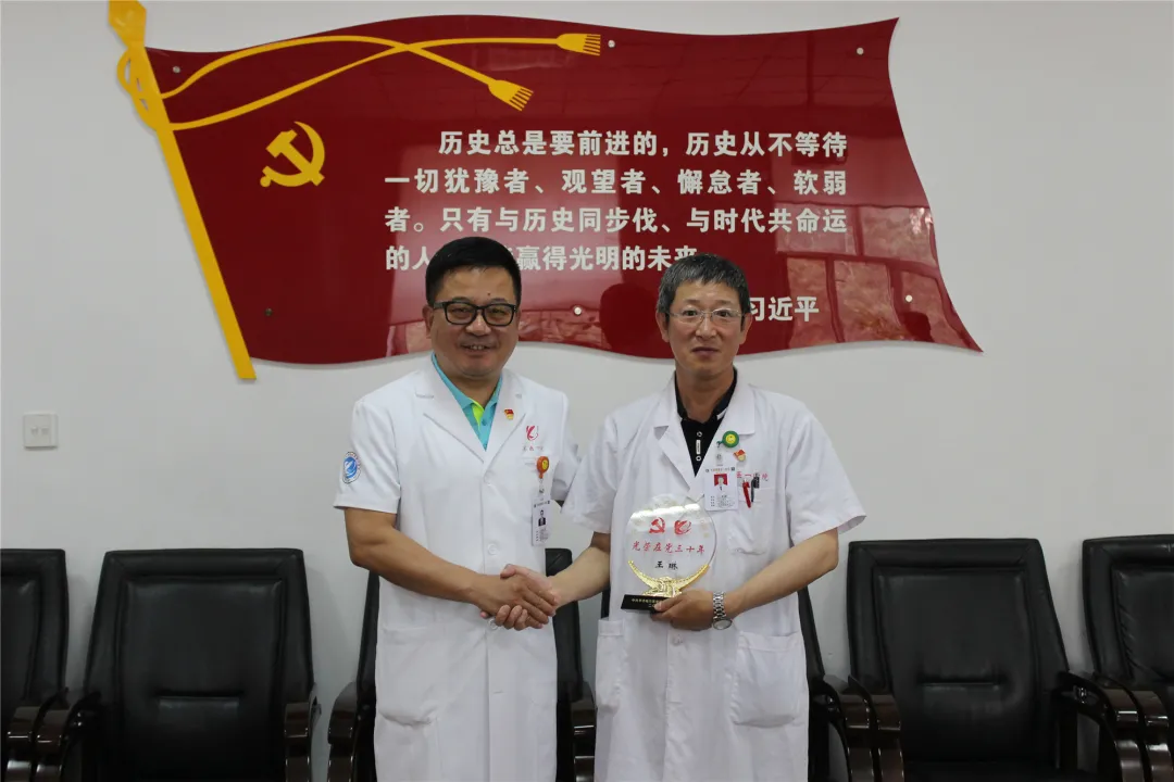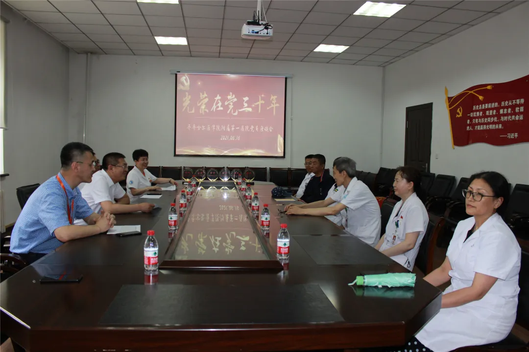 在中国共产党成立100周年前夕,为进一步增强老党员对党组织的认同感和归属感,6月16日,齐医附属一院在第一会议室组织召开“光荣在党三十年”党员座谈会,医院具有三十年以上党龄的老党员,党委书记张可勇、院长党委副书记李忠原、副院长刘增良参加座谈会,党委委员党办主任吴颖主持会议。