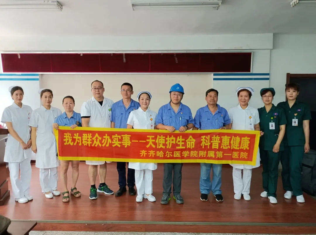 7月14日,齐医附属一院护理部主任范桂红、副主任张敏、骨外科四病区副主任王雪峰、急诊科护士长张艳及护理科普讲师团成员共计七人深入中国一重轧电制造厂,为一线职工普及创伤的现场急救知识及心肺复苏术,用实际行动践行党史学习教育“我为群众办实事”,推动实现“健康中国”战略。轧电制造厂40余人参加本次科普讲座活动。