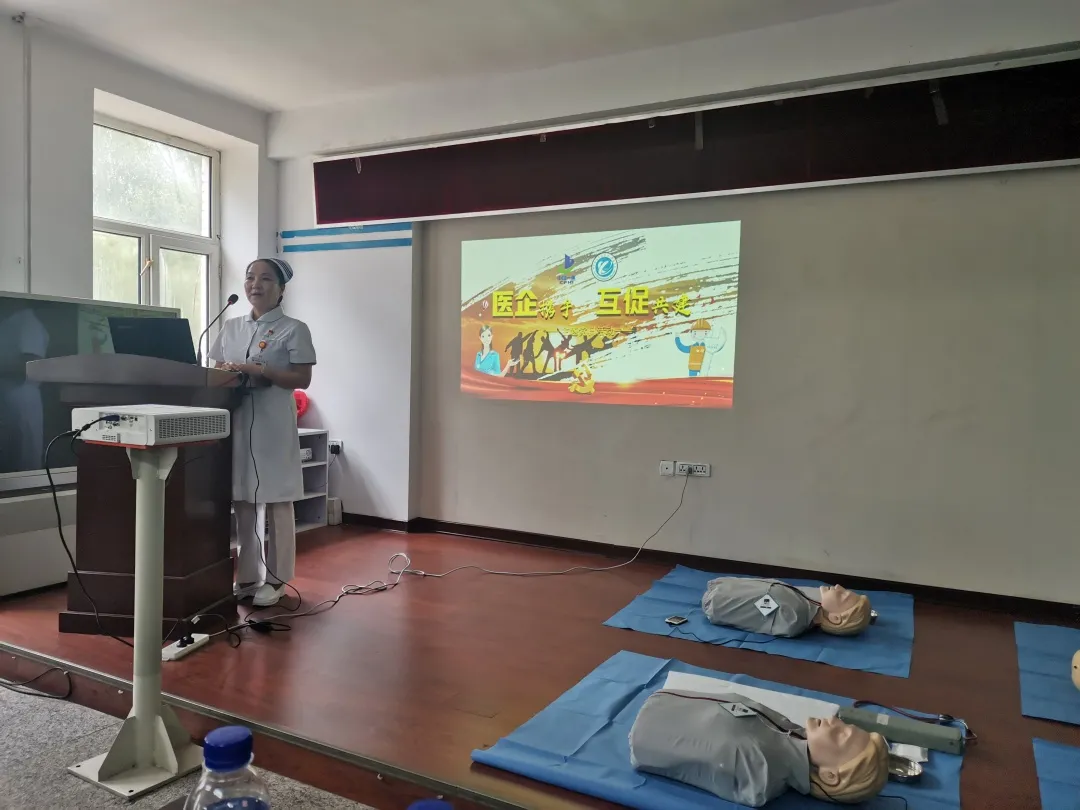 护理部张敏副主任运用通俗易懂的语言讲解心肺复苏的相关知识和技术要领。护士韩佳宁现场进行了心肺复苏术的标准演示。科普宣讲员们为与会职工提供一对一的心肺复苏术演练指导。