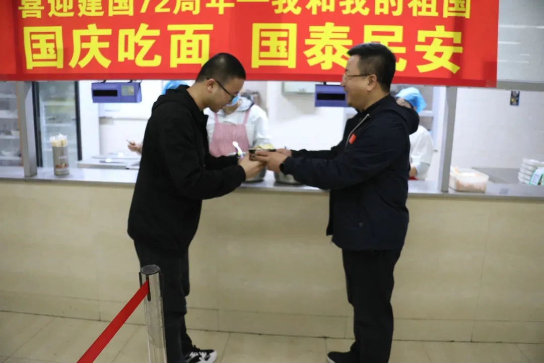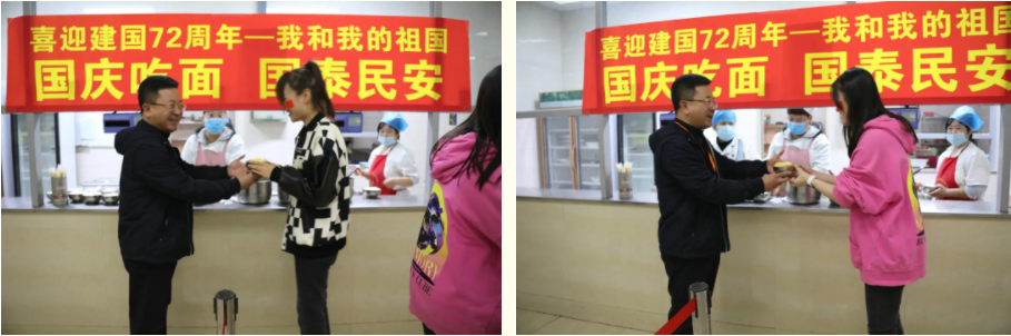 作为中华儿女,我们深知“面”是中华民族的传统美食,历史悠久。吃面,简单的仪式背后,是极致的热爱。李忠原院长亲自来到学生食堂和师生们一起为祖国母亲庆生,亲手为师生们送上国庆面,如此接地气的“仪式感”里,寄托着全体师生对新中国72岁生日满满的真挚情感和纯粹的美好祝愿。