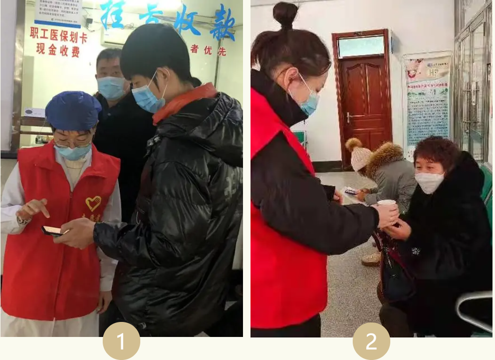 党员邱丽宏指导患者手机挂号 积极分子李佳琪为等待患者送热水