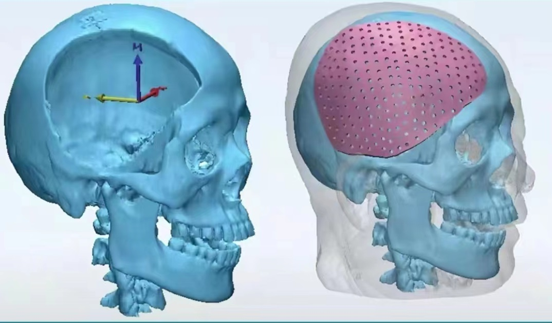 与传统手工塑形相比,数字化3D塑形技术耗时短、贴合度好,符合生理解剖形态并且术后外形恢复良好,因为植入材料与骨窗边缘贴合度好,从而减少了钛钉的使用数量、术野暴露时间及并发症发生率。因为,钛合金颅骨修补材料的特点是具有合适的强度与刚度,材料厚度薄、质量轻,抗压性较强,塑形简单,钛钉固定稳定性好,具有合适的生物相容性、稳定性、低致敏性、无毒性和无致癌性,植入人体后可永久保留;因此,目前钛合金颅骨补片是临床上普遍使用的颅骨修补材料。
