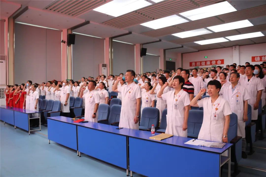 会议在雄壮的国歌声中拉开帷幕,全体医师起立,在医务部部长张羽镝的带领下,重温《中国医师誓言》。