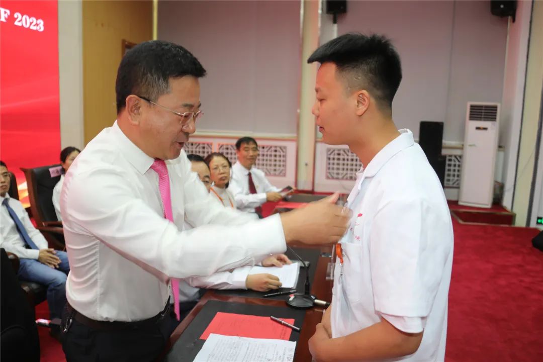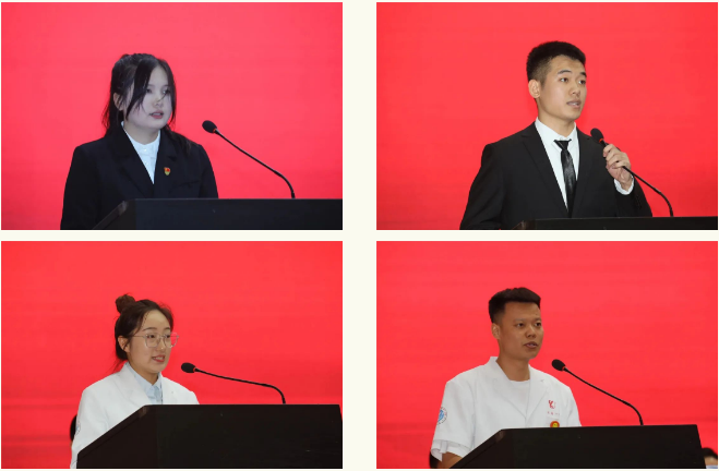 2019级学生代表王佳源、2020级学生代表隋鑫鹏、2022级住培学员陈晶、2023级外科学硕士研究生周硕作为不同层次学生代表发言。院长、党委副书记李忠原教授为2023级硕士研究生周硕同学佩戴校徽。