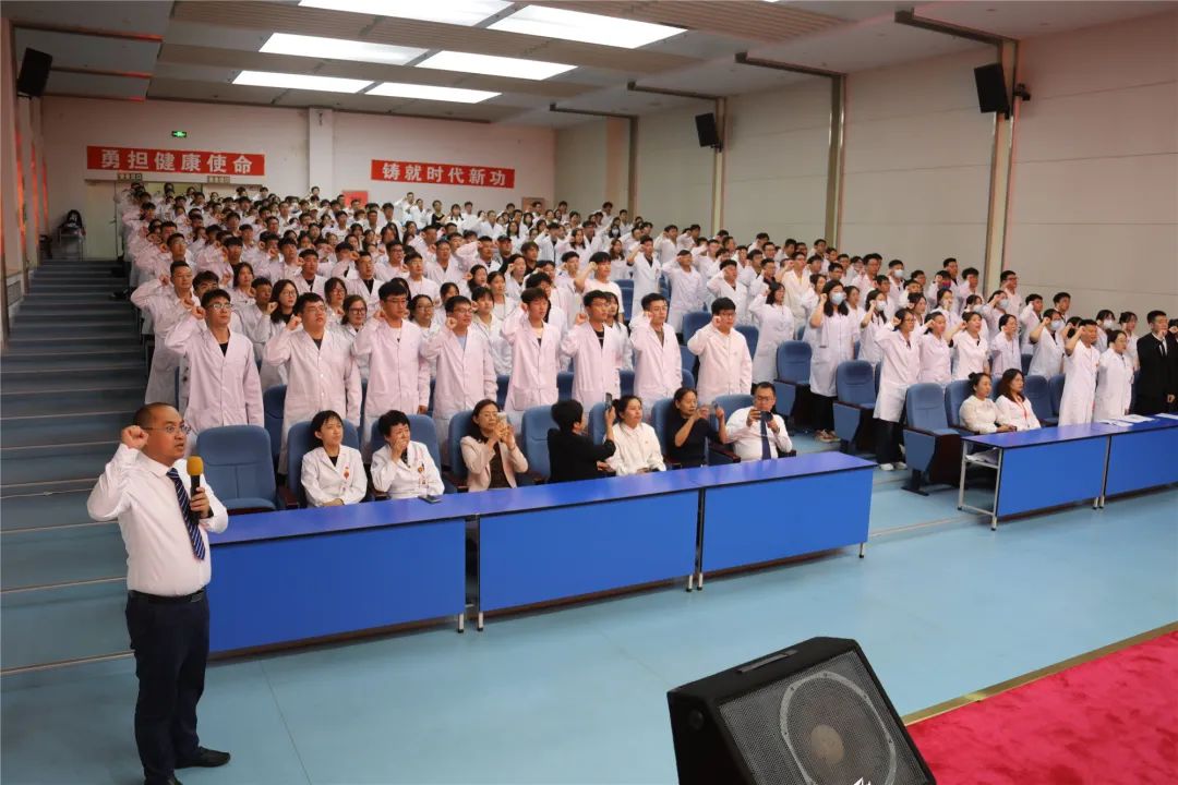 在参会人员热烈的掌声中,院领导及教师代表入场到主席台就坐。2023级本科新生的歌曲快闪直接将典礼气氛拉满、热情点燃。会议在雄壮的国歌声中拉开帷幕,全体新生起立,在教务科科长徐清刚的带领下,重温《医学生誓词》,庄严的宣誓声响彻会场,表达了大家积极投身医疗事业、钻研医学知识、维护医学事业神圣与纯洁的决心。