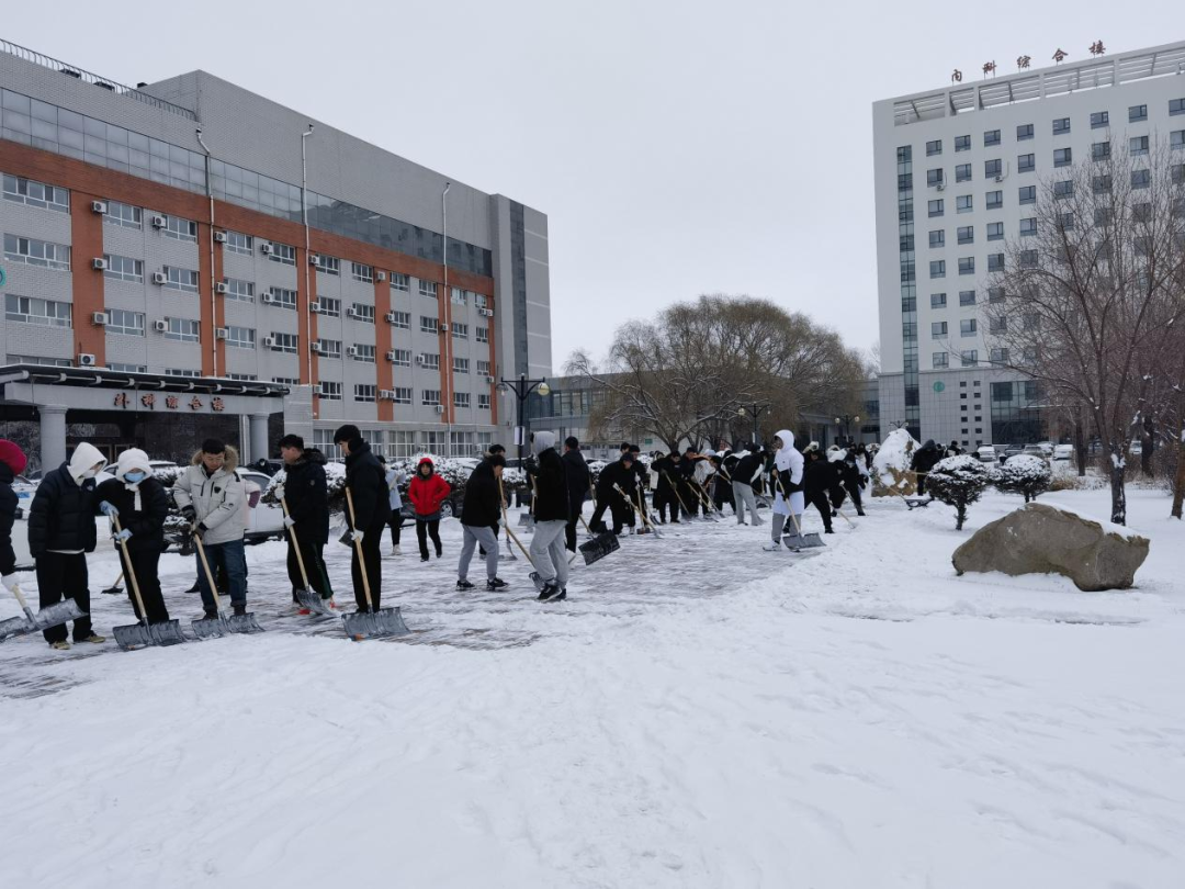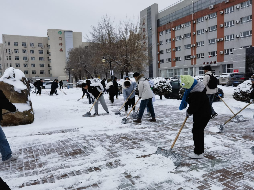 志愿者拿起铁锨、扫帚等铲雪工具不畏严寒,齐心协力,经过紧张的辛勤劳动,院区内人行步道砖路段和2号楼门前的积雪已清理干净,消除了路滑安全隐患,为来院就诊的患者和职工、学生出行提供方便。