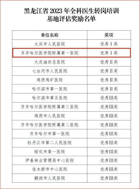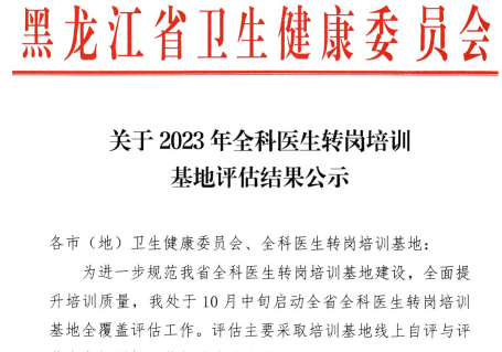 12月6日,黑龙江省卫生健康委员会公布2023年全科医生转岗培训基地评估结果,我院在全省32家培训基地中荣获优秀Ⅰ类奖。