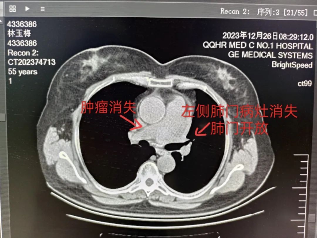 (注:肿瘤明显缩小,胸闷气短症状消失)