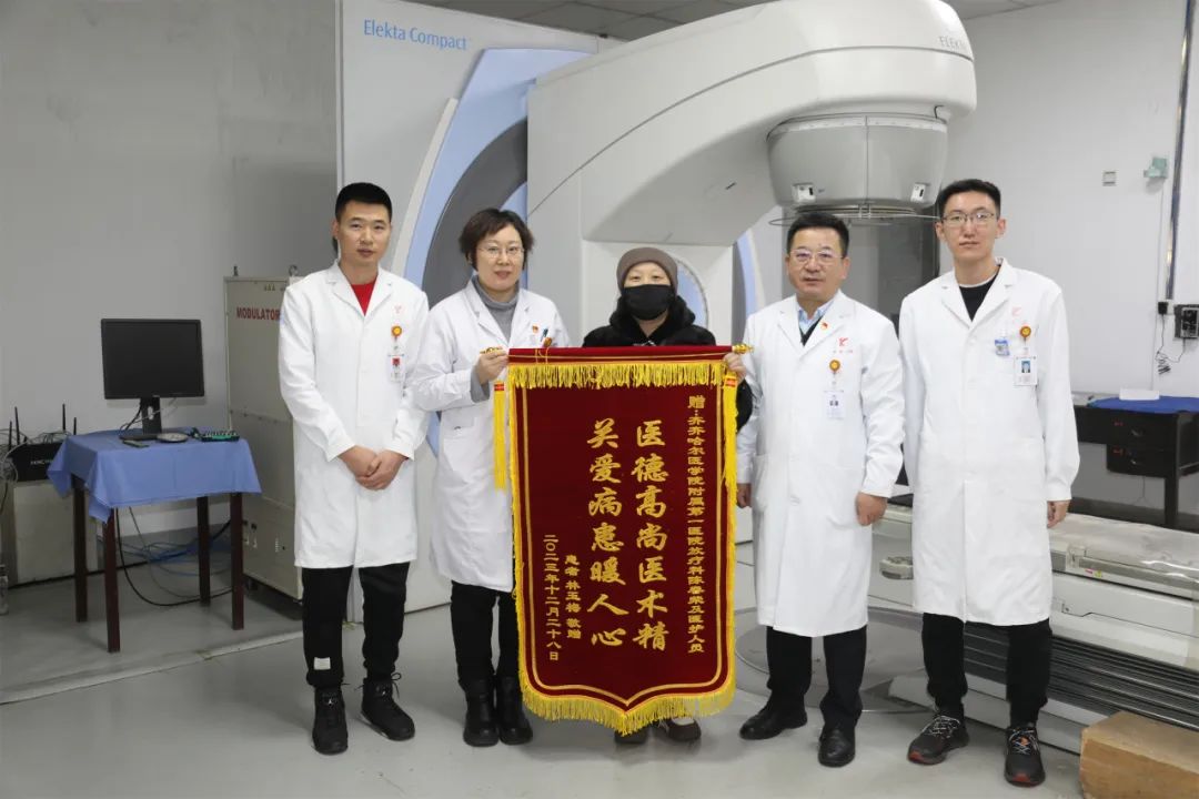 2023年12月29日,家住龙江县的患者林女士刚刚在齐医附属一院结束放疗,亲自为肿瘤放疗科赠送了一面锦旗,由衷感谢肿瘤放疗科医护人员无微不至的关心和精细的治疗。恰逢医院院长、党委副书记李忠原带队进行行政查房,他亲切地询问患者病情转归情况及身体状况,对于此次治疗的效果和满意度等;赞扬陈春荣主任医技精良、全心全意为患者暖心服务;嘱托林女士好好休养,有任何问题及时到医院来。林女士眼含热泪,亲切的握住院领导和陈主任的手,暖暖情意萦绕在患者心间。