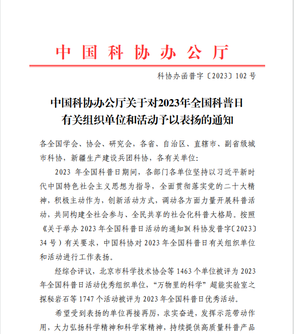 近日,《中国科协办公厅关于对2023年全国科普日有关组织单位和活动予以表扬的通知》(科协办函普字“2023”102 号)文件发布,授予齐齐哈尔医学院附属第一医院为2023 年全国科普日活动优秀组织单位。