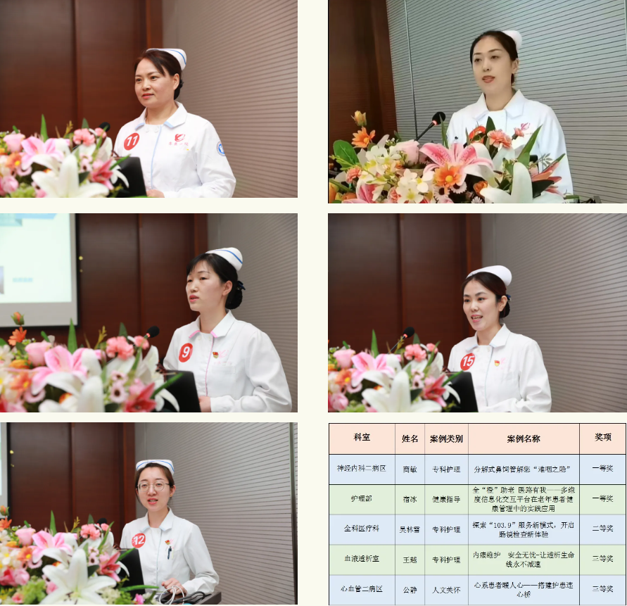 竞赛现场,我院参赛选手从优秀护理服务案例实施背景、具体实施、创新亮点、实施效果等方面进行了汇报,体现了我院护理人员的临床思维,展现了我院护理特色、护理效果,分享护理体会,获得现场领导和观众的一致好评。