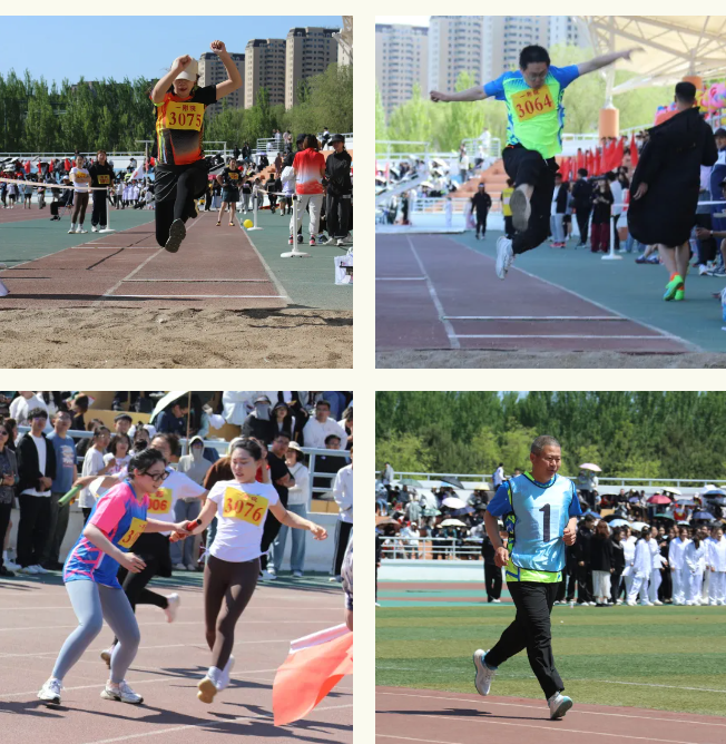 本次运动会设有田赛、径赛、接力赛,以及拔河比赛、多人跳绳、击鼓颠球等多个趣味竞赛项目。赛场上,我院运动员积极参与各个项目,挥洒汗水,奋勇拼搏,佳绩频传。其中,我院2020级全科班学生李婷婷包揽学本女子组跳高、跳远第一名,并以1米41的好成绩,打破原学本女跳高1米40的大会记录,刷新学院学本女跳高纪录;妇产科迟娜包揽职工女子组铅球、铁饼第一名;牟军澳获得职工男子跳远第一名;集体项目“旋风跑”获得职工组第一名。此外,传染性疾病科杜园获得职工女子组100 米短跑第二名、检验科王娜获得职工女子组标枪第二名、牟军澳获得职工男子100米短跑第四名、周子渝获得职工女子组跳高第四名、韩雪获得职工女子组跳远第五名的好成绩。