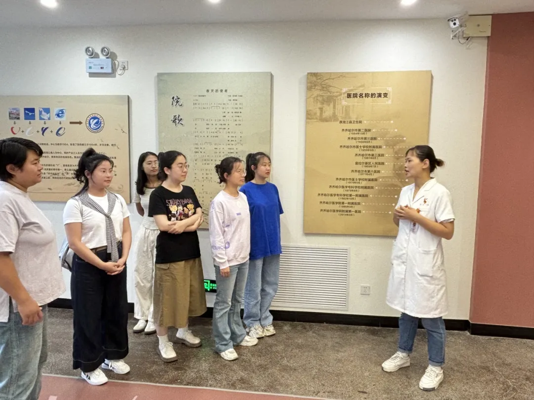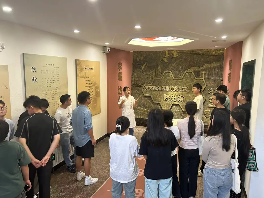 齐医附属一院是伴随着新中国第一个“五年计划”的落成而建立,院史馆记载了医院的发展历史和红岸现代医学史,宣传科副科长孙双滨声情并茂地为年轻学子们讲解医院不同时期的发展建设和突出成绩。1971年,医院创建齐齐哈尔市第一个痔科;1978年,医院成功开展黑龙江省第一例膝关节置换术;1986年,医院助推学院创建了中国第一个妇产本科专业;2002年,医院成功开展先心病手术……。医院承担国家六五、七五攻关课题,在八十年代开展遗传咨询门诊和新生儿尸检工作……。老一辈附属一院人艰苦奋斗、刻苦钻研、精益求精,为医疗事业奋斗终身的不懈追求和情感寄托深深感召每一位在场学生。