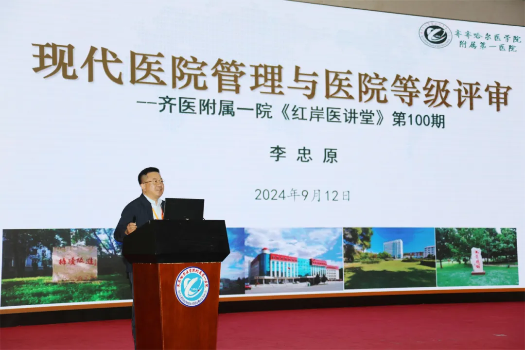 9月12日下午,《红岸医讲堂》100期在齐齐哈尔医学院附属第一医院学术报告厅正式开讲。院长、党委副书记李忠原主讲《现代医院管理与医院等级评审》,为医务工作者科普先进的医院管理经验和方法,助力我院顺利晋升第三轮三甲医院评审和医院的高质量发展。