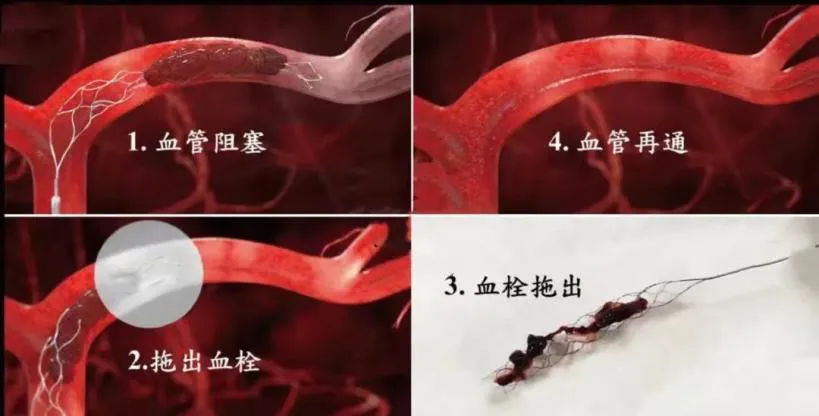 使用脑血管微创介入技术,在大腿根部的股动脉或手腕处桡动脉进行穿刺,借助取栓支架、抽吸导管、球囊等材料,将闭塞部位的血栓取出,对闭塞的脑血管进行再通,以最快的速度开通闭塞的脑血管,恢复脑血流,争分夺秒挽救处于缺血状态的脑组织、脑细胞。