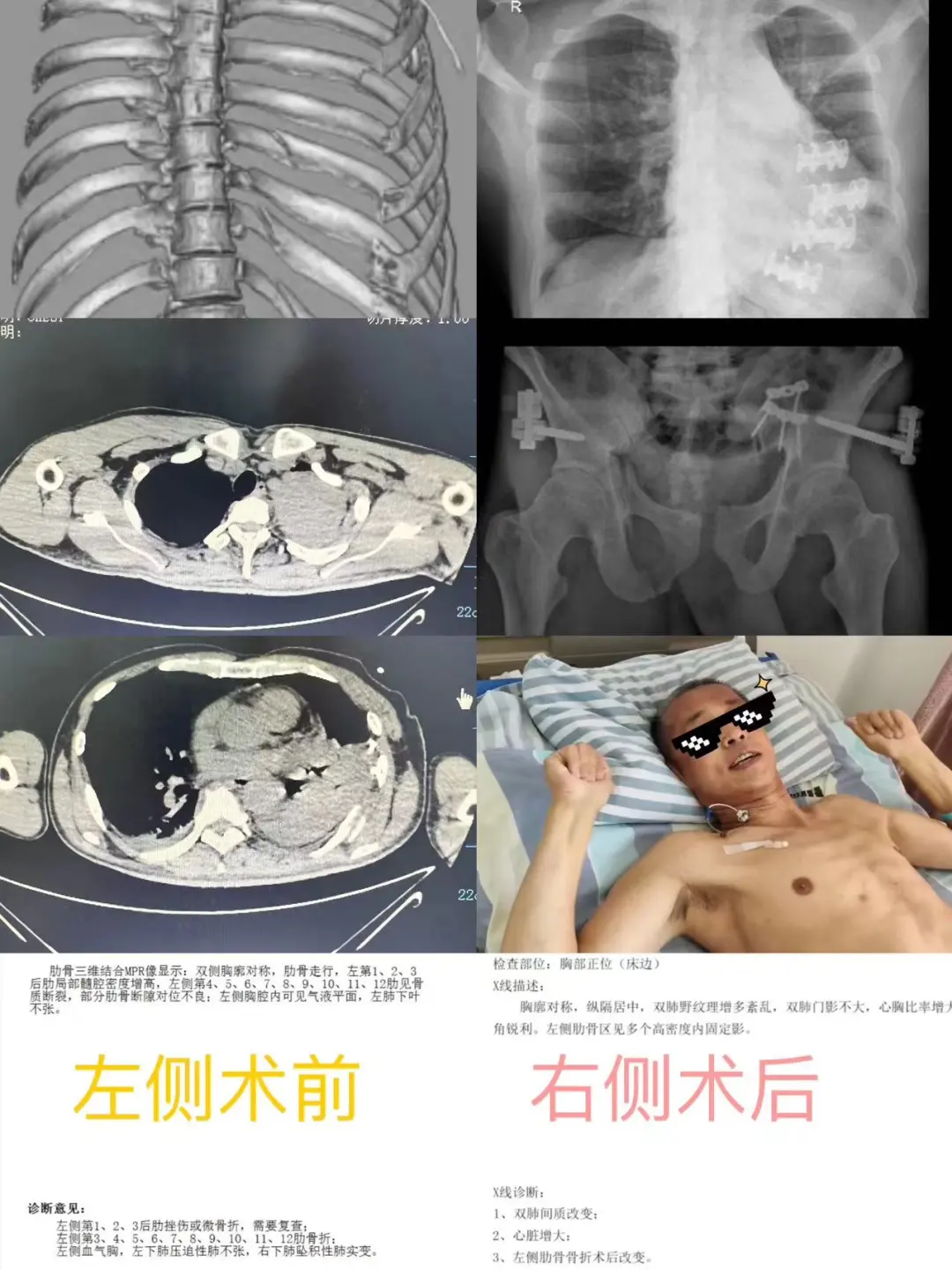 紧急情况发生后,龙江县医院的120救护车迅速响应,第一时间将梁先生送到了齐医附属一院。急诊科立即开通静脉通道,经过CT检查,医生发现梁先生左侧有大量血气胸,多处肋骨骨折,骨盆也多处骨折。其中,部分肋骨断端刺入胸腔,造成肺部裂伤,存在失血性休克和呼吸衰竭的风险,病情极为急迫。