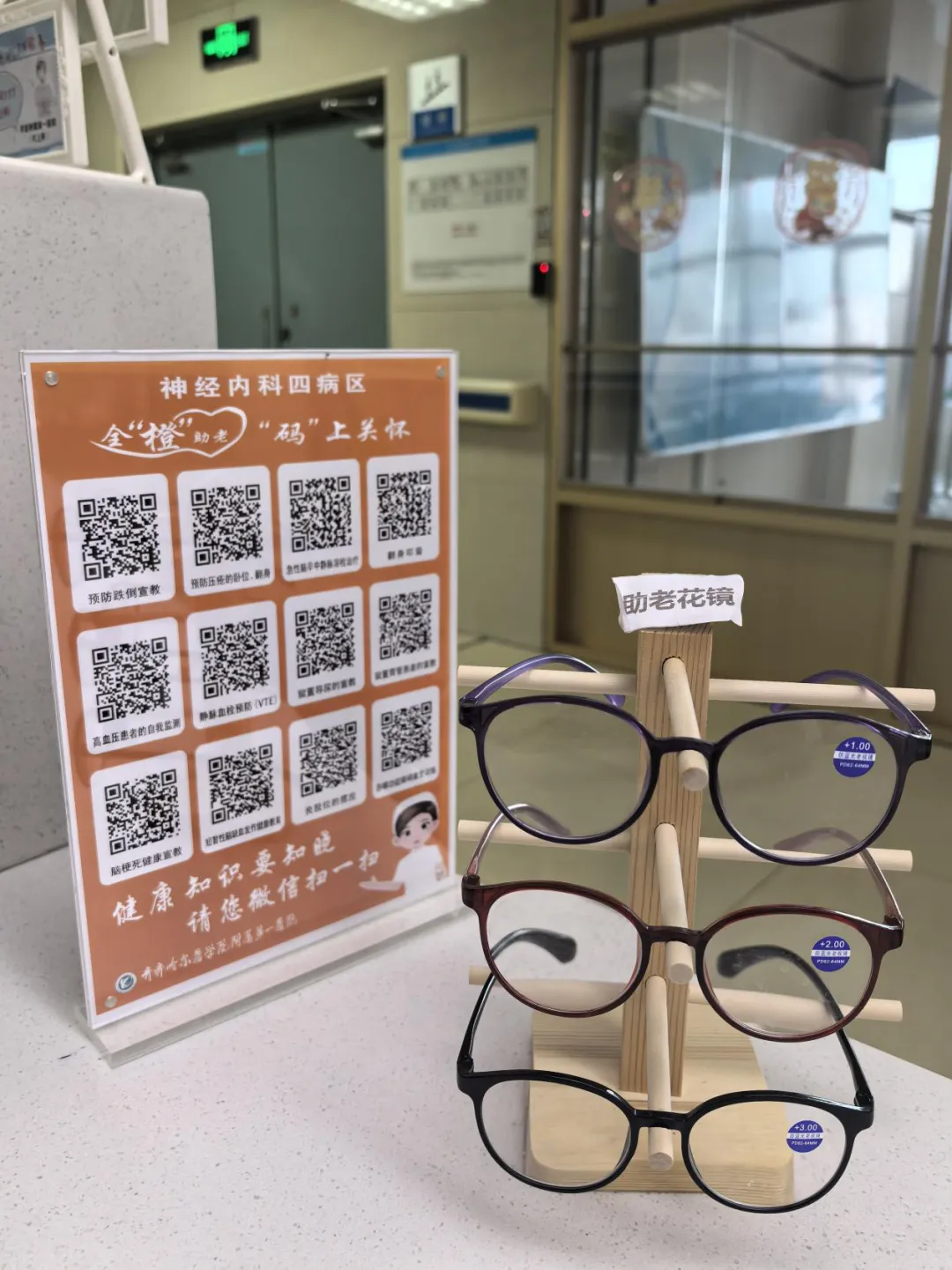科室人员在工作中细心地发现,在阅读或者签字时,经常会遇到有视力障碍的患者或者家属,于是科室便精心准备了100度、200度、300度等不同度数的老花镜,有效解决了老年人视力不便的问题。