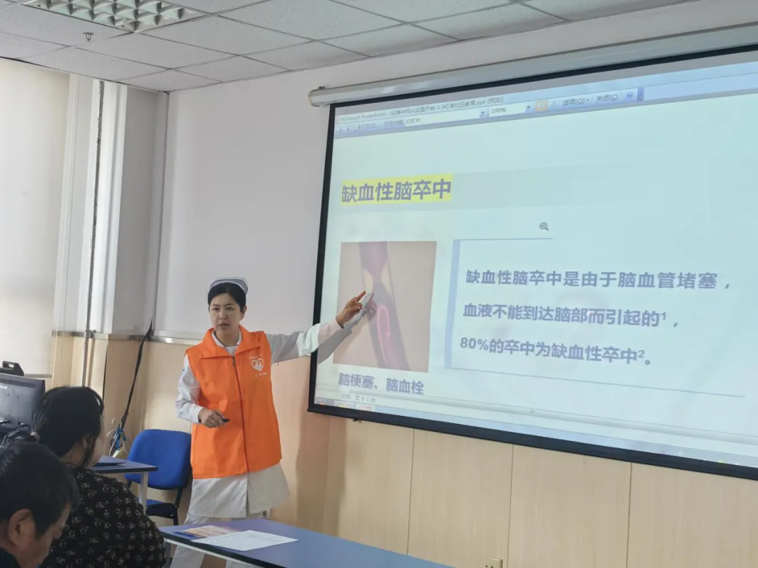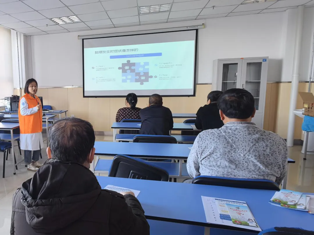 于洋护士长讲解了卒中小知识和如何治疗脑卒中,其中包括卒中的定义、如何快速识别卒中、现场急救关键点、如何溶栓治疗。讲课期间还准备了一些互动小问题,大家都积极参与,课堂气氛非常活跃。