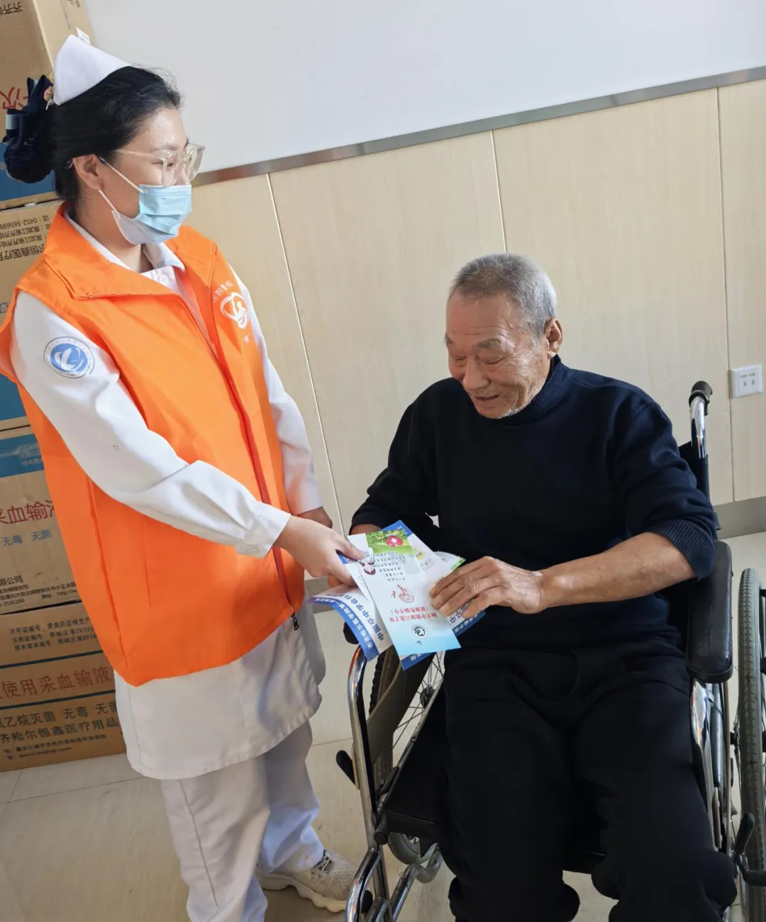 讲课前,科室护士为老年患者发放有关脑血管疾病方面的宣传手册,方便了解脑血管疾病方面的知识。