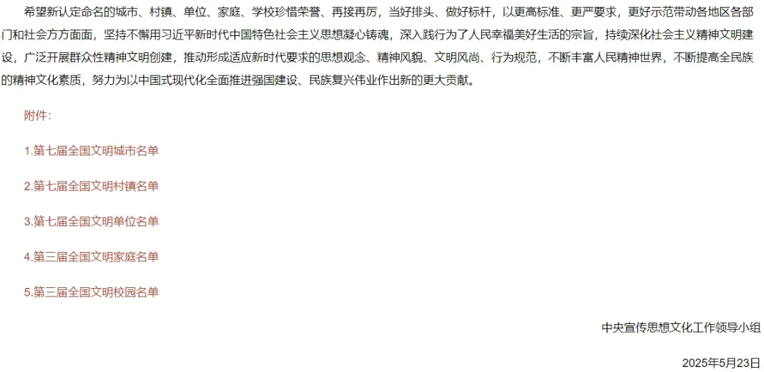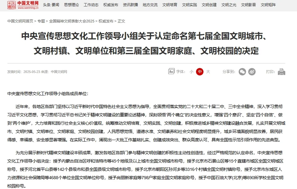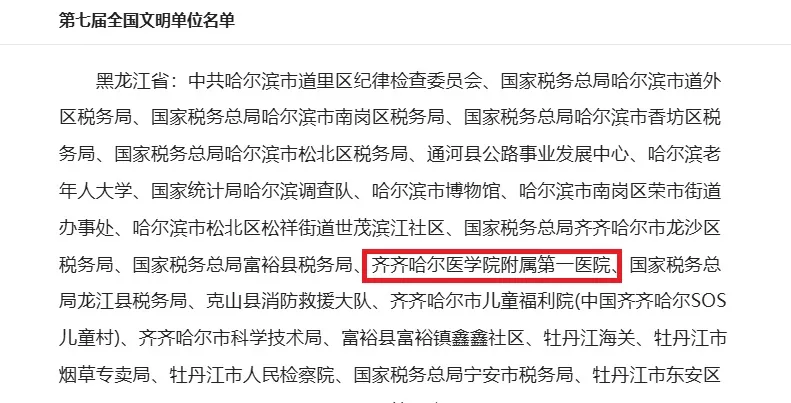 2025年5月23日,中央宣传思想文化工作领导小组公布《关于认定命名第七届全国文明城市、文明村镇、文明单位和第三届全国文明家庭、文明校园的决定》,齐齐哈尔医学院附属第一医院喜获第七届全国文明单位殊荣。这是我院继2014年被授予“省级文明单位标兵”称号后,扎实推进精神文明建设结下的又一丰硕成果。