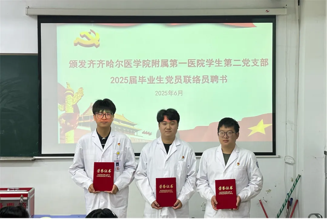 同时,为加强毕业生党员与党组织的长期联系,特别设立“毕业生党员联络人”聘任仪式。李思瑶书记为李修宸、雷硕、张智博三名同学颁发聘书,勉励他们成为母校与校友之间的纽带,持续传递党的声音,凝聚青春力量。