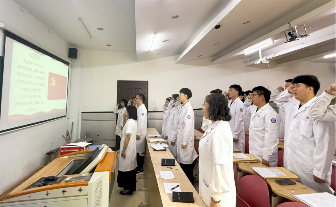 在宣传委员郐英殊老师的带领下,新发展党员庄重地佩戴上党徽,面向党旗庄严宣誓,其他党员重温入党誓词。铿锵有力的誓言回荡在会场,彰显了毕业生党员对党忠诚、为共产主义事业奋斗终身的坚定决心。
