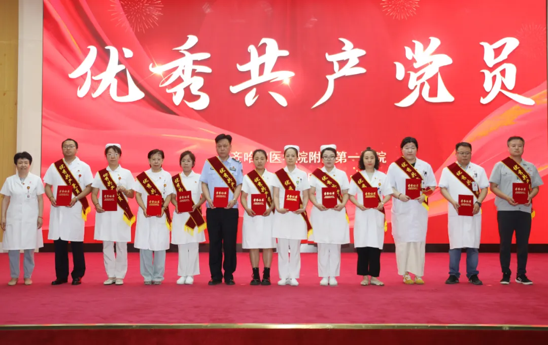 副院长艾立辉宣读《关于命名表彰2024-2025年度先进基层党组织、优秀共产党员和优秀党务工作者的决定》。副院长刘忠锦、薛徽,纪委书记张娜,党委委员、党办主任吴颖为优秀共产党员、优秀党务工作者、先进基层党组织代表颁奖。心血管内科三病区副主任刘佳、妇产党支部书记王丹分别代表优秀共产党员、先进基层党组织作表态发言。