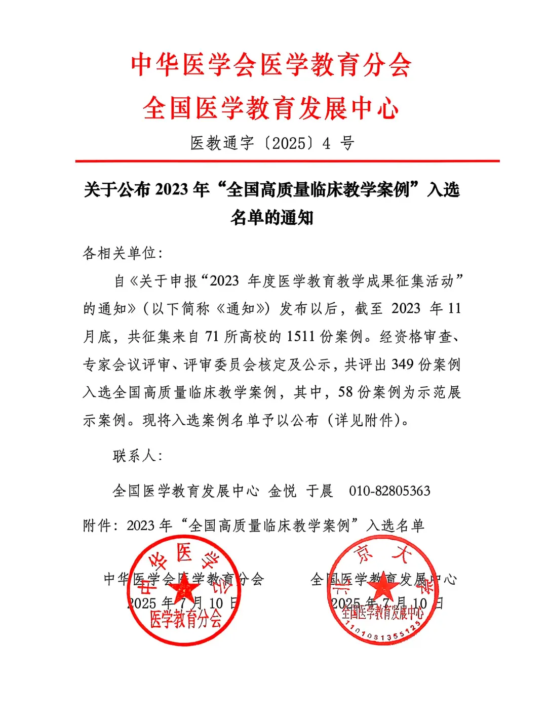 2025年7月10日,中华医学会医学教育分会、全国医学教育发展中心联合发布《关于公布2023年“全国高质量临床教学案例”入选名单的通知》,齐医附属一院羡微微老师负责、夏颖、丁天航、陈西参与编写的《循环系统-急性ST段抬高型心肌梗死》案例,经过资格审查、专家会议评审、评审委员会核定及公示等层层严格筛选,成功入选2023年全国高质量临床教学案例。
