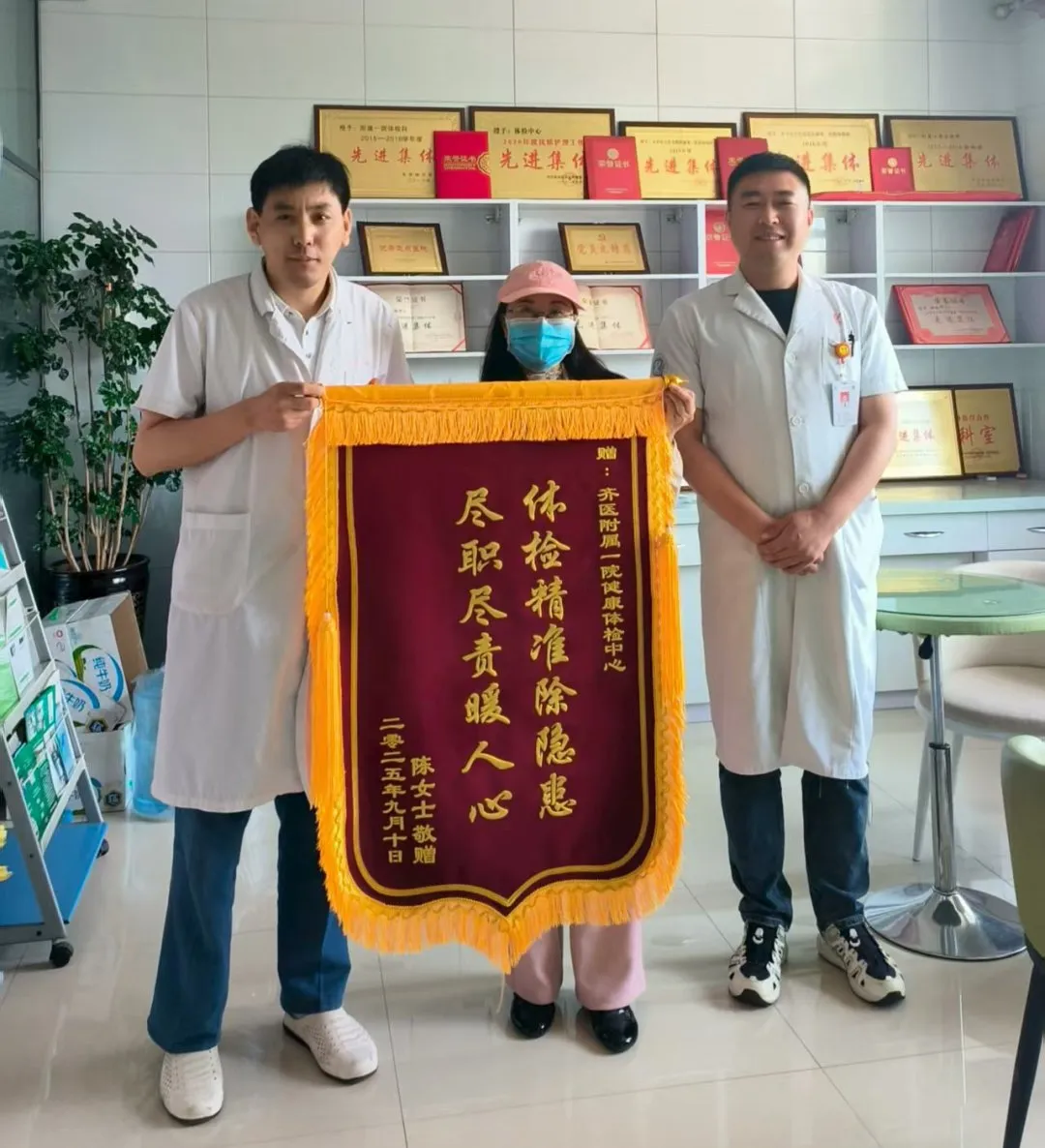 “要不是杨大夫一次次主动回访、耐心叮嘱,我这病可能就耽误了!现在想想都后怕,是体检中心的医护人员给了我第二次生命!” 近日,甘南县患者陈女士手捧绣有 “体检精准除隐患 尽职尽责暖人心”的锦旗,再次走进齐医附属一院健康体检中心,一边完成年度复查,一边向医护人员反复表达感激,眼眶里满是激动的泪水。