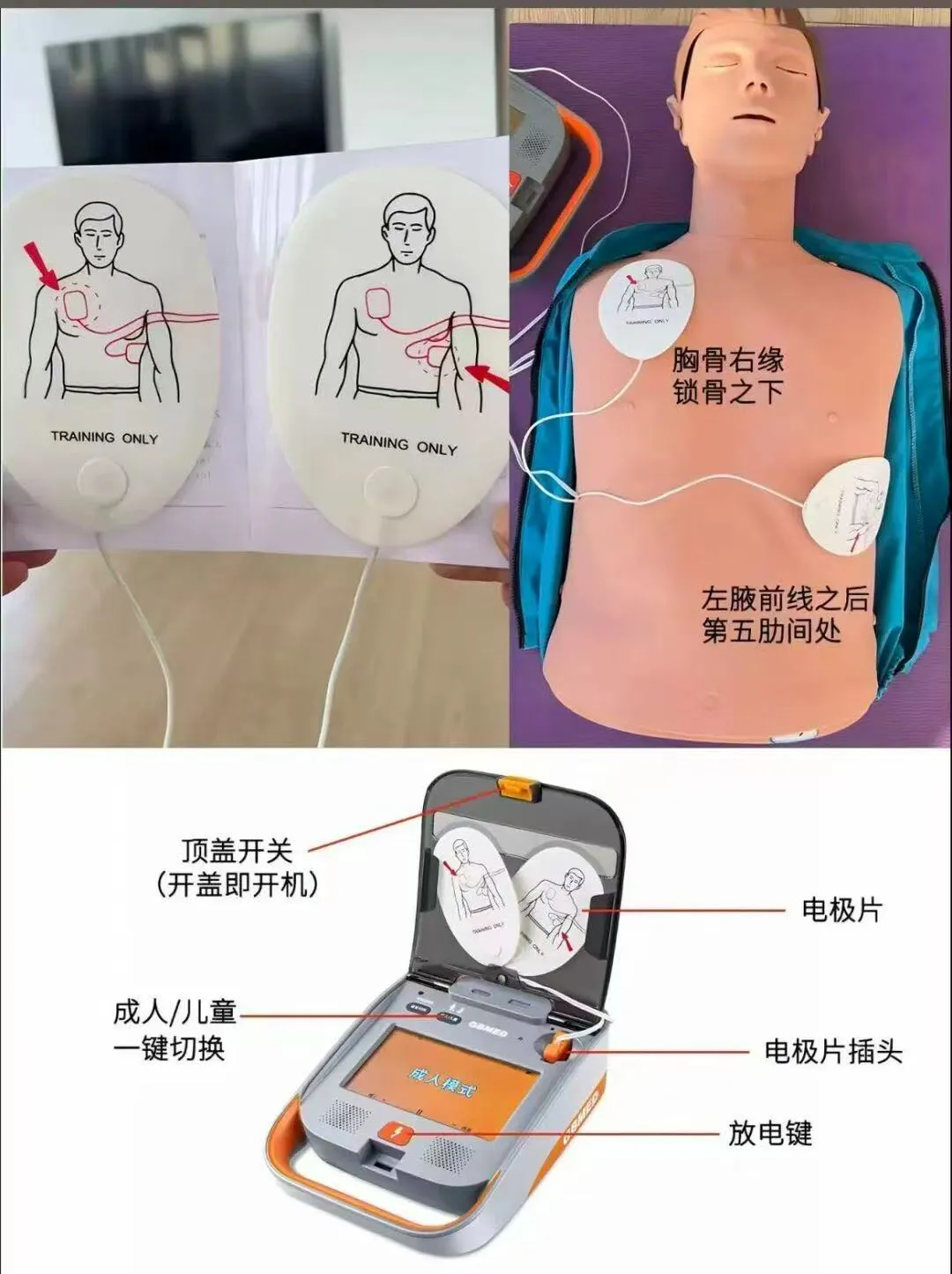 AED的使用主要分为以下几个关键步骤,操作过程中设备还会全程语音提示,引导使用者完成操作: