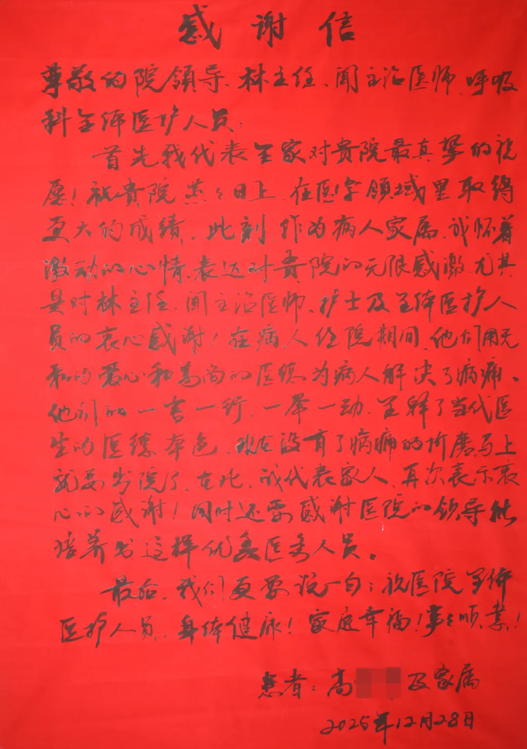 近日,齐医附属一院呼吸科收到了一份特别的礼物——患者家属亲笔书写的大红纸感谢信。信中字字情真意切,不仅饱含着对林志国主任、闻名丽主治医师及呼吸科全体医护人员的诚挚谢意,更彰显了我院医患之间的暖心温情。