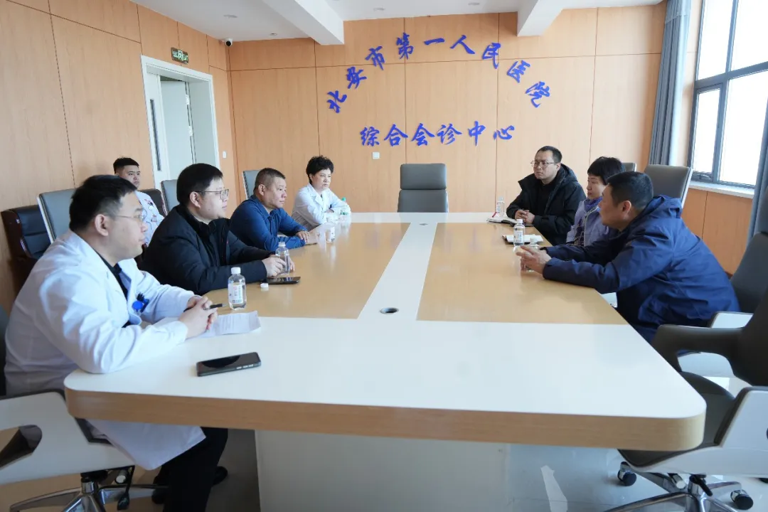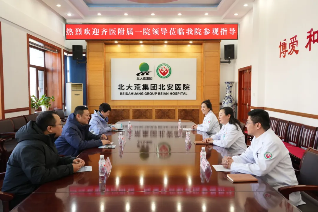 上午,刘旭之书记一行首先来到北安市第一人民医院。作为荣获“全国最美县医院”称号的三级甲等综合性医院,该院与我院有着深厚合作基础。座谈会上,刘书记详细介绍了学院办学特色、人才培养成效及2026届毕业生整体情况,强调医院始终坚持立德树人,培养理论扎实、实践过硬的高素质医学人才。北安市第一人民医院负责人介绍了医院发展、学科建设及人才需求,高度评价在岗齐医毕业生的综合素养。双方就建立长期稳定实习就业合作、推进“实习+就业”一体化培养模式达成共识,计划在2026年春季招聘中为齐医学子开辟就业绿色通道,提供更多优质岗位。